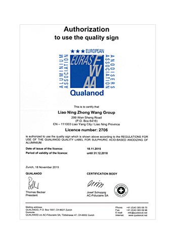 欧洲Qualanod铝氧化产品质量标志使用许可证